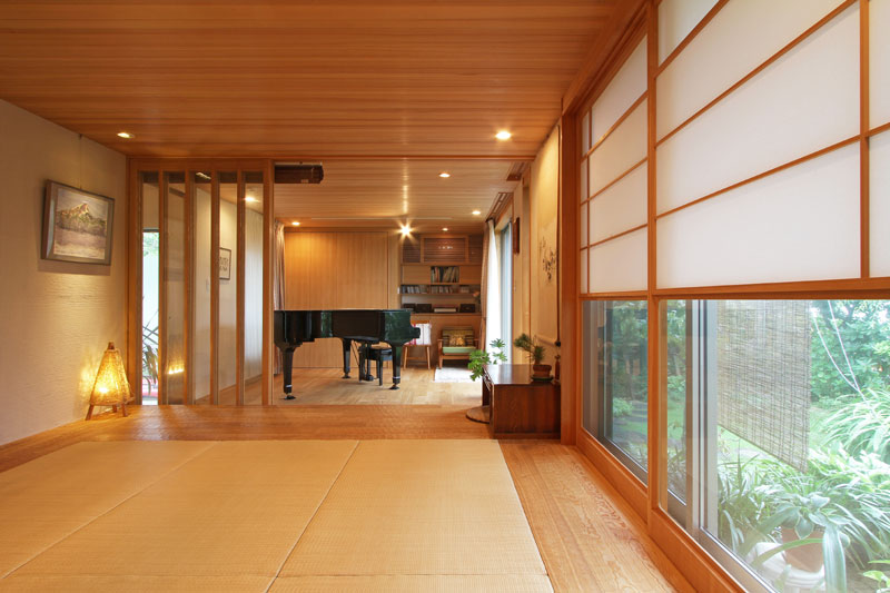 無垢の床にい草の畳、壁には大谷石。