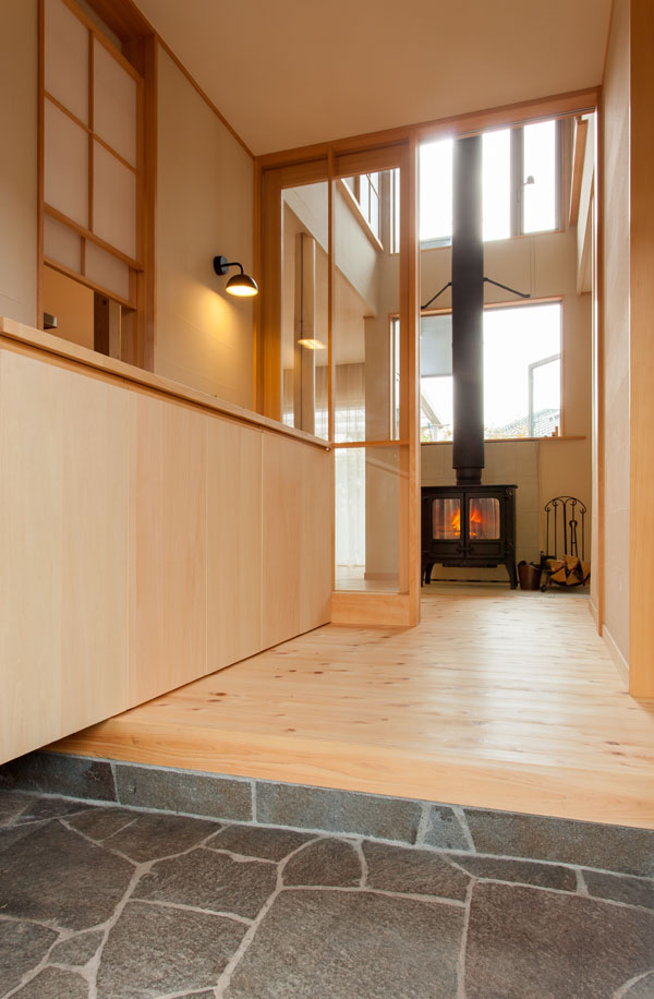 無垢の床に珪藻土。玄関は元々のの石貼りを活かして。