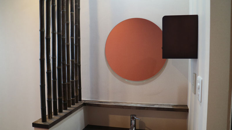 洗面台の鏡に映りこんだ赤が夕日のようでとてもきれいです。。