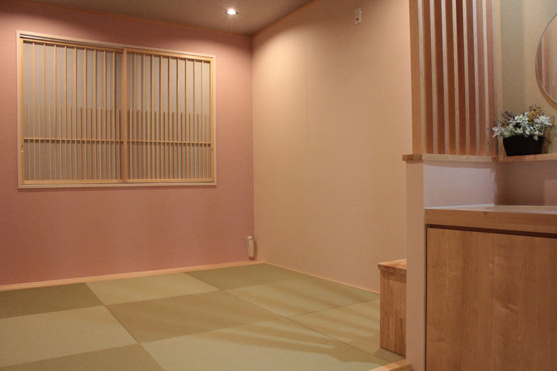 畳の若草色、アクセントのピンク、春ですね。