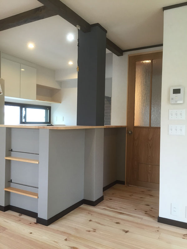 キッチン部分の適度な目隠しも兼ねてアクセント柱として