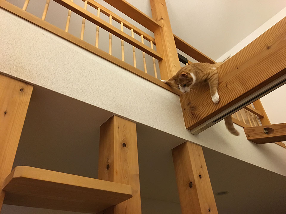 梁の上から『ニャーニャー』話しかけて来ました。