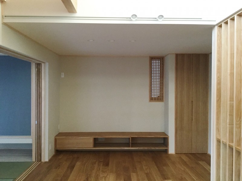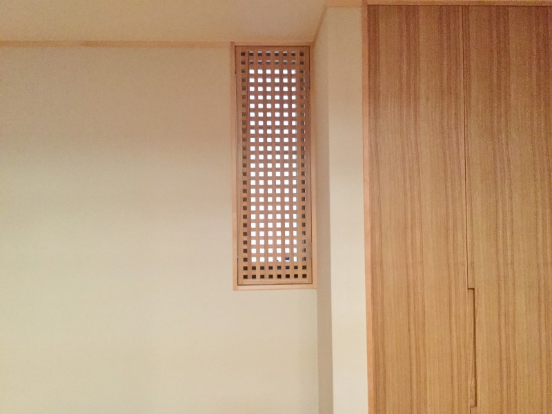横の天井いっぱいの収納戸と、小窓の格子戸も