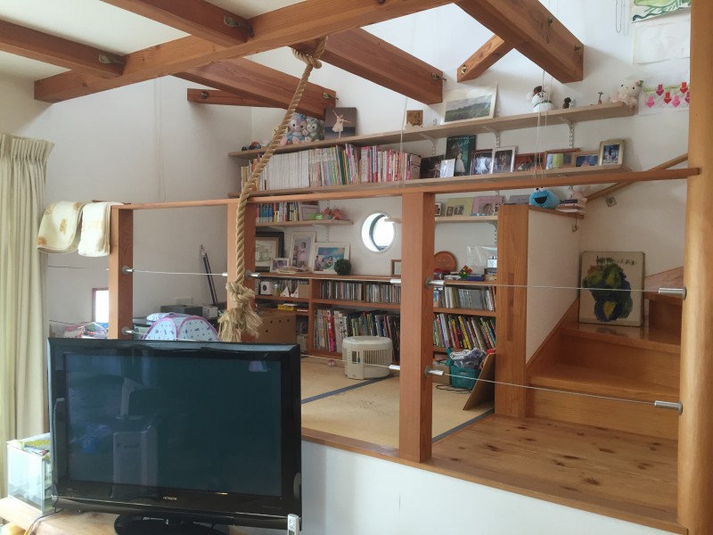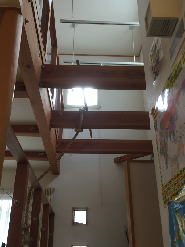 吹抜けの梁には筋トレの懸垂用?の木の棒