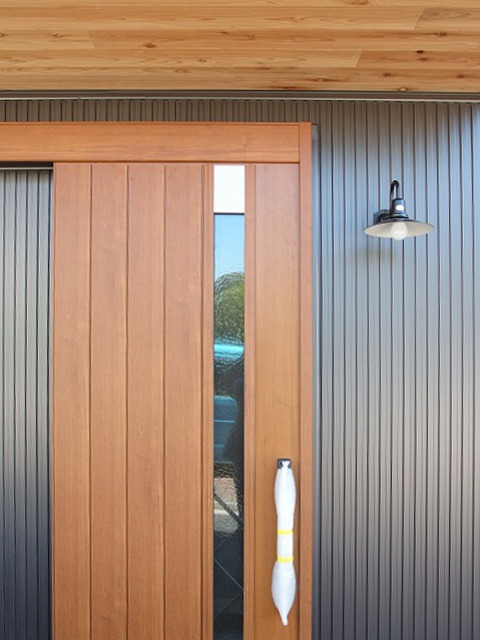玄関の軒裏には不燃木仕上げでアクセントを。