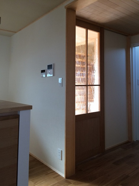 玄関からリビングに入るタモ無垢の引戸。