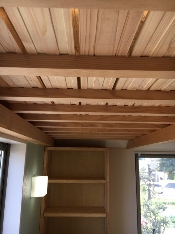 固定後、大工さんが勾配天井の石膏ボードを張り、