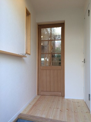 玄関からリビングへの入口建具はタモ無垢の造作。