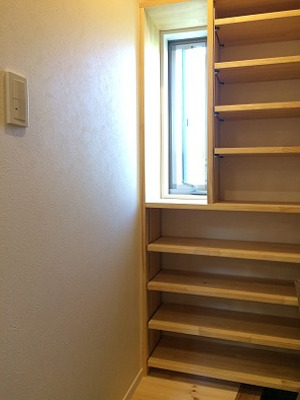 シューズクロークは可動棚を施し、