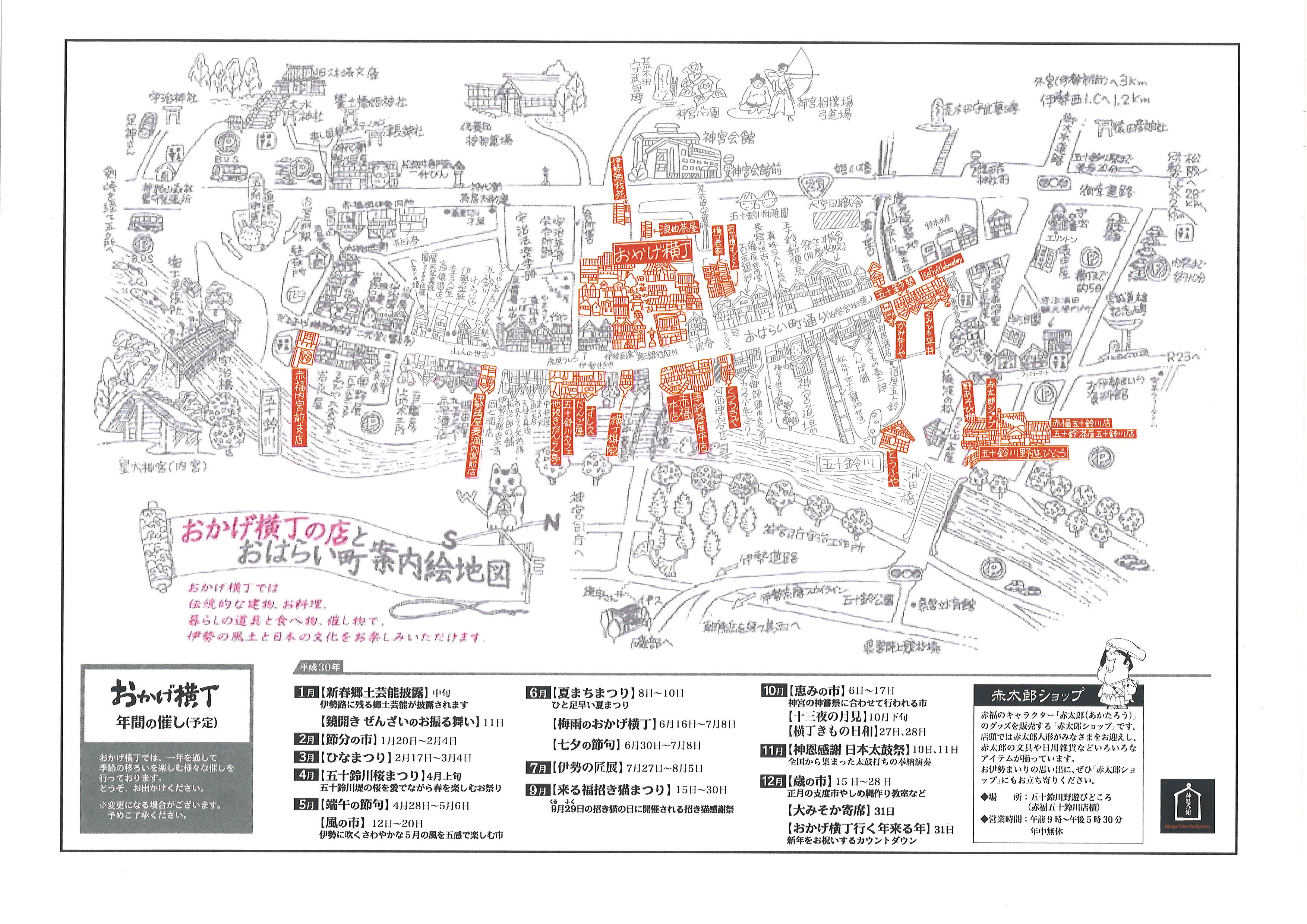 内宮周辺の「おはらい町・おかげ横丁」の地図。